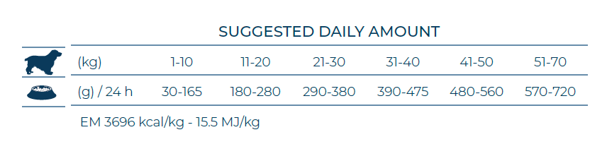 Analitinės sudedamosios dalys: drėgnis 8%, žali baltymai 26%, žali riebalai 12,5%, žalia ląsteliena 2,6%, žali pelenai 7,3%, kalcis 1,3%, fosforas 1,1%, Omega-3 0,8%, Omega-6 3,0%. Energinė vertė: 3696 kcal/kg – 15,5 MJ/kg.