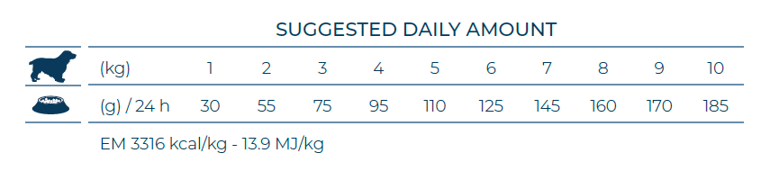 Sudėtis: hidrolizuoti gyvūniniai baltymai 22%, malti ryžiai, ryžių pamiltės, celiuliozės ląsteliena, džiovinti dumbliai (Ascophyllum nodosum) 8,5%, runkelių griežiniai, dehidratuota žuvis 5%, žuvų taukai, žalių kukurūzų gemalų aliejus, mineralai, mananoligosacharidai (MOS), fruktooligosacharidai (FOS), šeriuotosios jukos (Yucca schidigera).